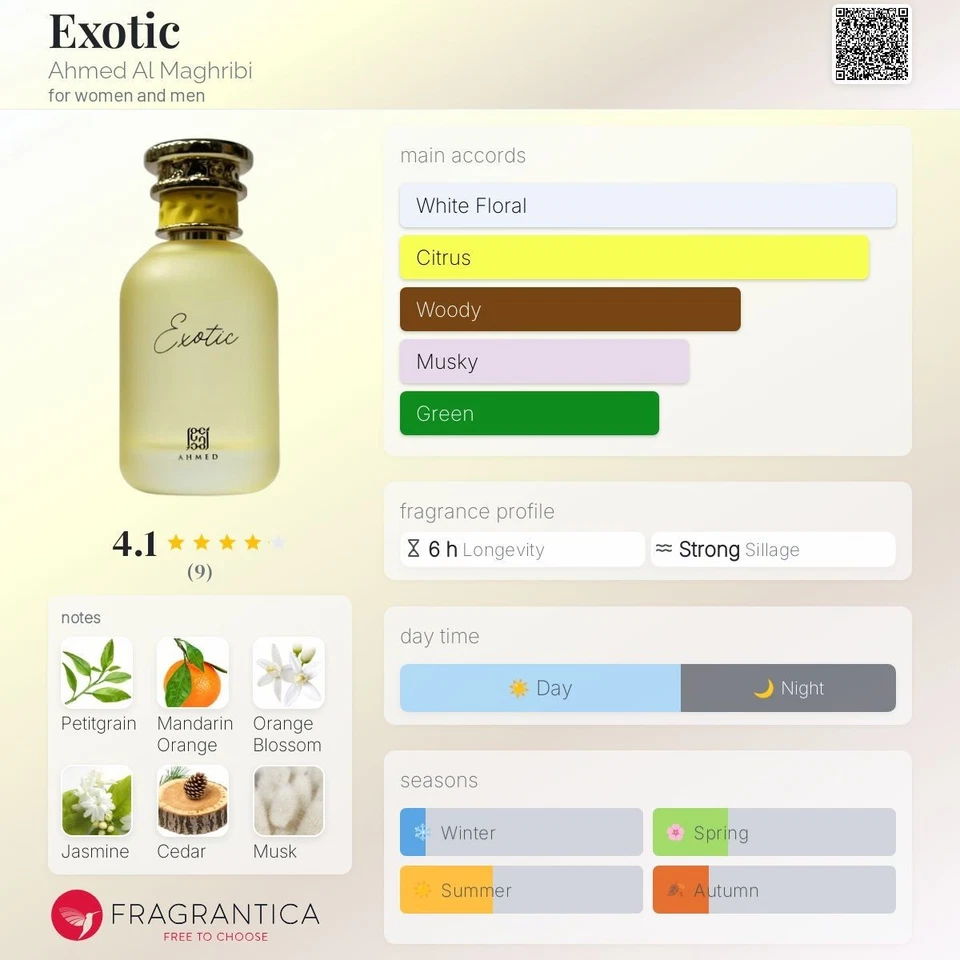 Discover the sophisticated charm of Exotic by Ahmed Al Maghribi, a premium 100ml Eau De Parfum crafted for both men and women. This luxurious Arabian fragrance delivers a warm, captivating scent that combines florals, woods, and musky sweetness for a truly unforgettable experience.